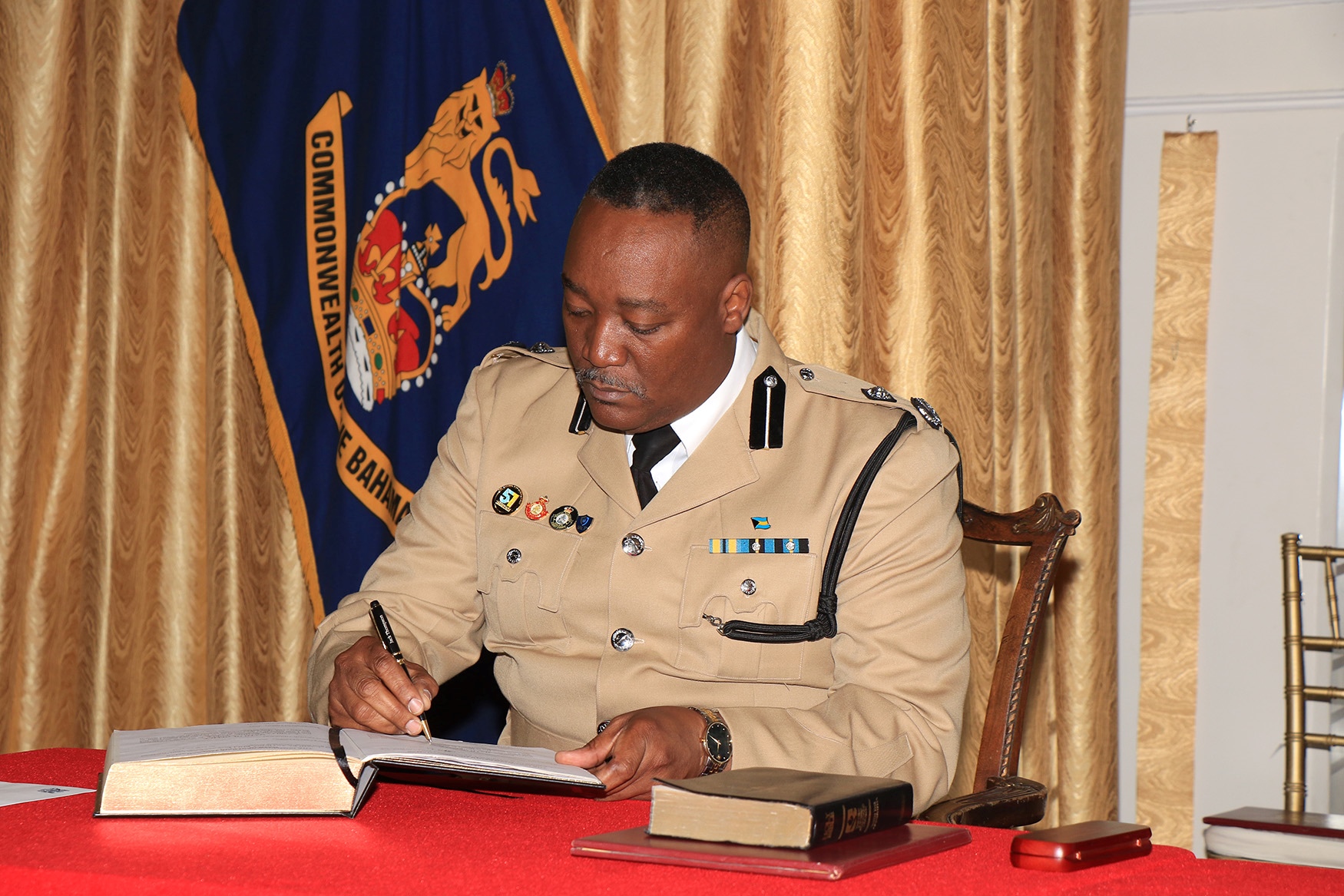 Senior Assistant Commissioner of Police Kirkwood Andrews, OM, was administered the Oath of Allegiance and Oath of Office by Her Excellency the Most Hon. Dame Cynthia Pratt, Governor General, and presented the Instrument of Appointment as Deputy Commissioner of Police during a Swearing-In Ceremony at Government House, on Saturday, January 4, 2025. The Hon. Wayne Munroe, KC, Minister of National Security, brought remarks. In attendance was Police Commissioner Shanta Knowles.